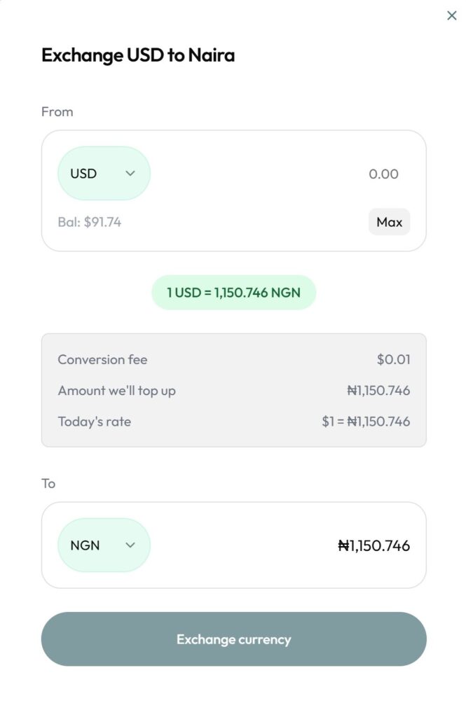 After funding your USD wallet, click on USD account on your dashboard and select convert. Choose the currency you want to convert your USD to (In this case Naira). In the “From” section, select USD. Click on Exchange currency.